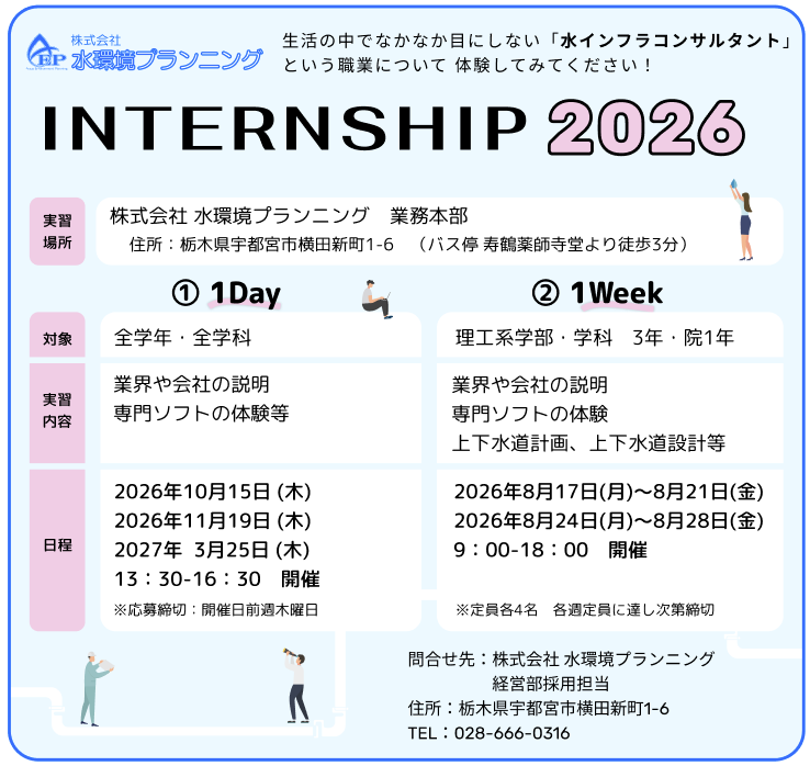 水環境プランニングの2026年度のインターンシップの開催についてお知らせします。