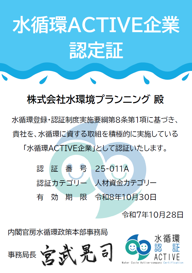 今年も当社の取組が認められ「人材資金カテゴリー」にて「水循環ACTIVE企業」として認証されました。